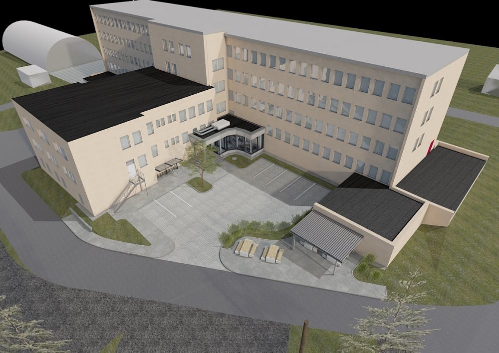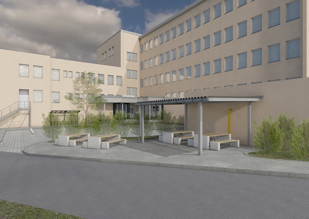 V rámci návrhu interiéru vstupního atria byla zpracována i idea úprav navazujících venkovních povrchů a